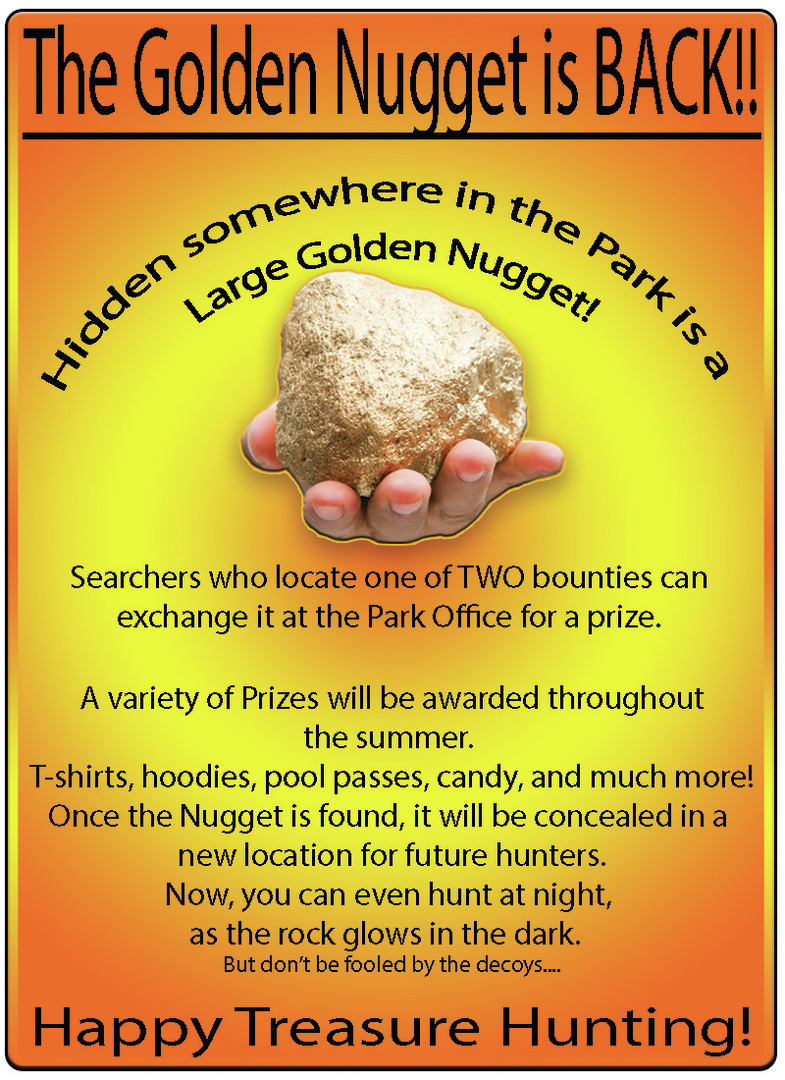 6 Golden Nuggets are hidden in the Park. If you find one, bring it to the Park Office and SPIN for a prize.